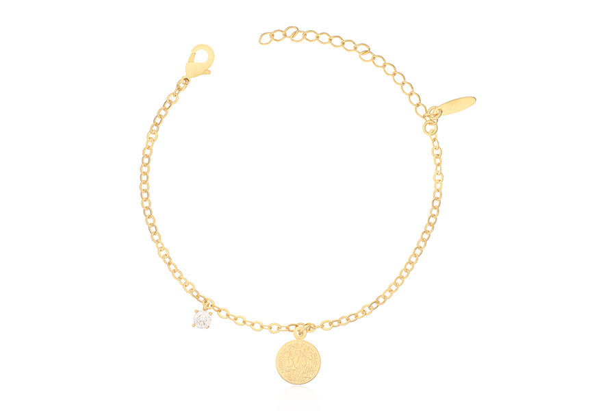 PULSEIRA INFANTIL BANHADA EM OURO, ELO DUPLO 1,80mm E CARTIER 3,50x1,90mm, 15cm COMPRIMENTO, CORAÇÃO, ANJO E CHAVE