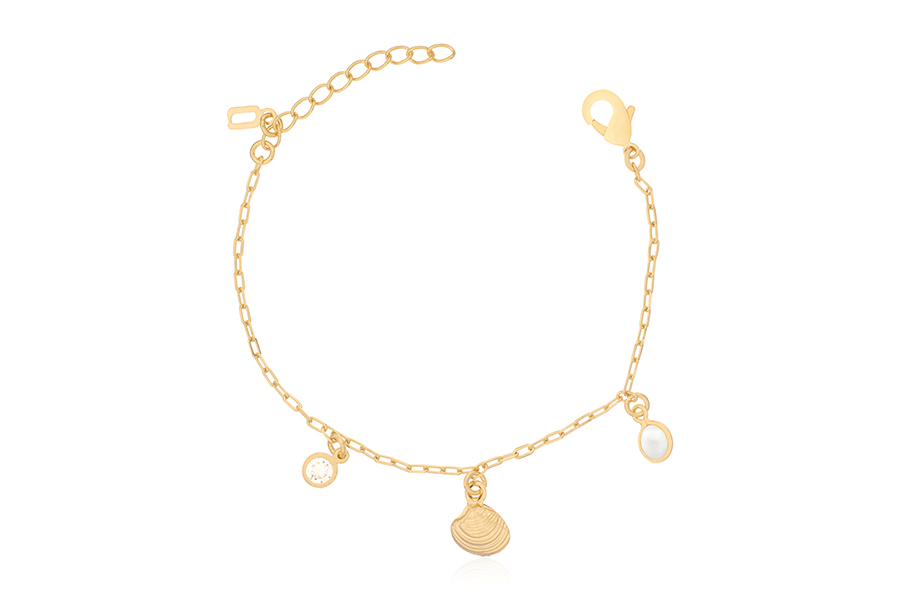PULSEIRA INFANTIL BANHADA EM OURO, ELO DUPLO 1,80mm E CARTIER 3,50x1,90mm, 15cm COMPRIMENTO, CORAÇÃO, ANJO E CHAVE