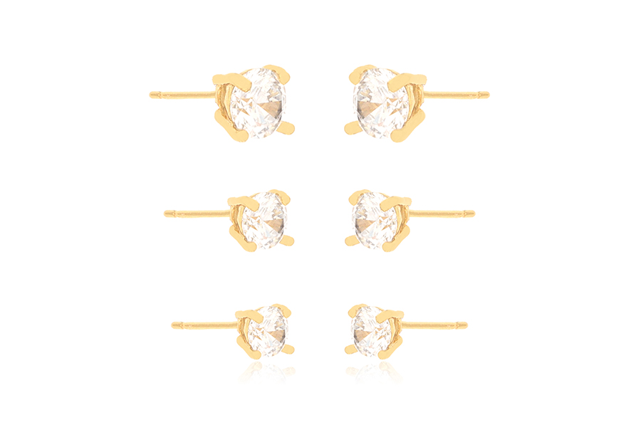 CONJUNTO BANHADO EM OURO, TRIO DE BRINCOS SOLITÁRIOS 5, 4 E 3mm