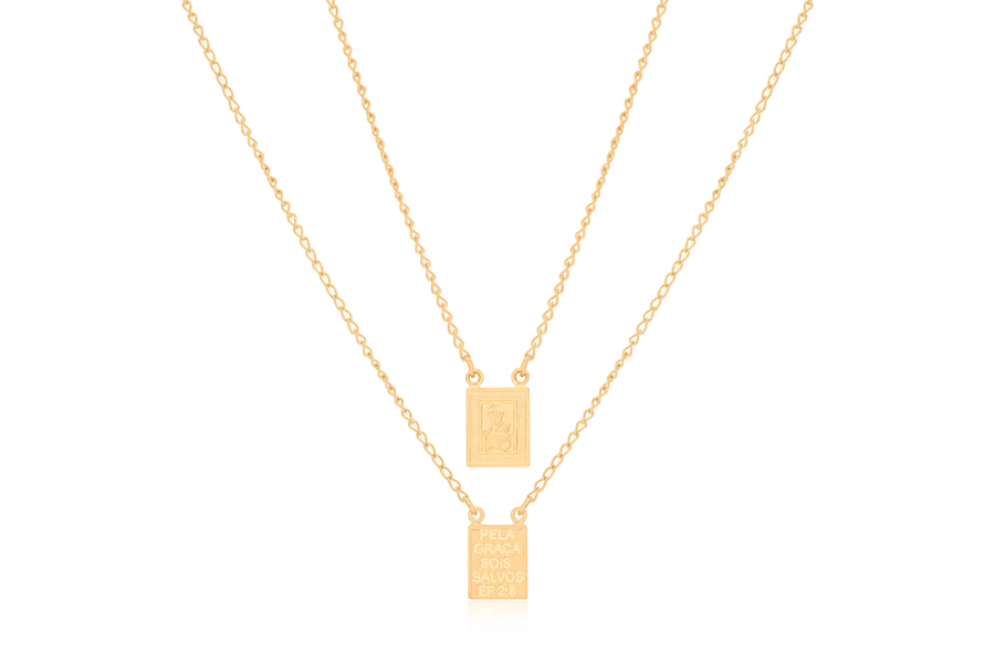 GARGANTILHA BANHADA EM OURO, ESCAPULÁRIO, 35cm COMPRIMENTO, MEDALHA 10X8mm, ''O SENHOR TE ABENÇOE E TE GUARDE'' E ''PELA GRAÇA SOIS SALVOS''