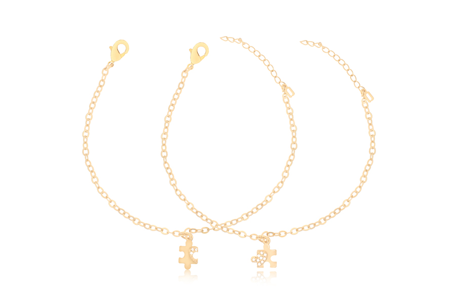 PULSEIRA INFANTIL BANHADA EM OURO, ELO DUPLO 1,80mm E CARTIER 3,50x1,90mm, 15cm COMPRIMENTO, CORAÇÃO, ANJO E CHAVE