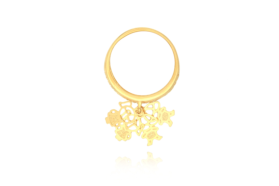 ANEL BANHADO EM OURO, MEIO ARO CRAVEJADO E PINGENTE BONECO COM ZIRCÔNIAS, MENINA