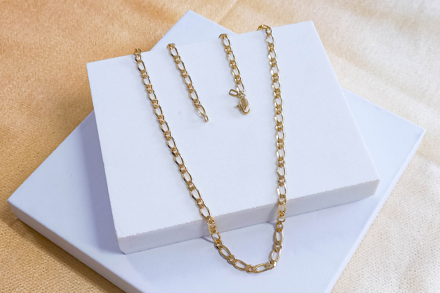 CORRENTE BANHADA EM OURO, ELO CORDA 3mm, 45cm COMPRIMENTO, EXTENSOR 5cm COMPRIMENTO E PESO 12,20g