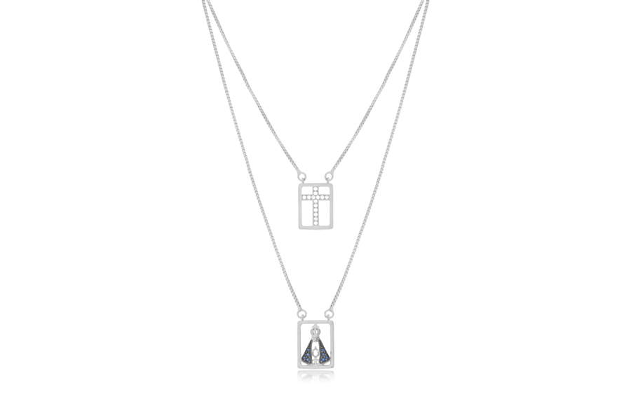 GARGANTILHA BANHADA EM RÓDIO BRANCO, ESCAPULÁRIO, 70cm COMPRIMENTO, APARECIDA E CRUZ