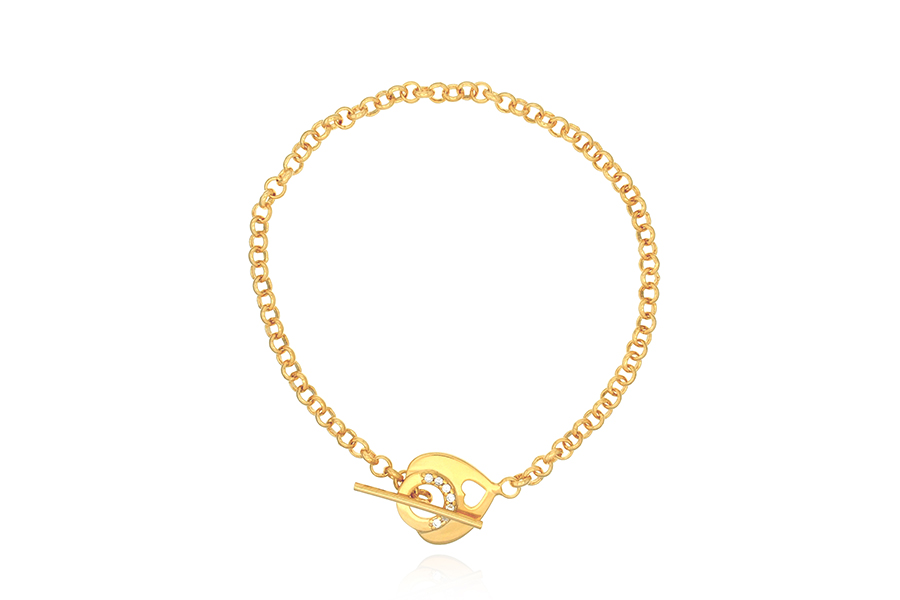 PULSEIRA INFANTIL BANHADA EM OURO, ELO DUPLO 1,80mm E CARTIER 3,50x1,90mm, 15cm COMPRIMENTO, CORAÇÃO, ANJO E CHAVE